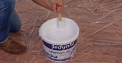 Naroża zabezpieczamy taśmą malarską, przyklejając ją na suchą powierzchnię. Farbę do gruntowania rozcieńczamy wodą (w przypadku gruntowania sufitu – do 20%, w przypadku gruntowania ściany – do 40%) i dokładnie mieszamy. Gruntowanie rozpoczynamy od malowania naroży i trudno dostępnych miejsc – używamy do tego małego wałka.